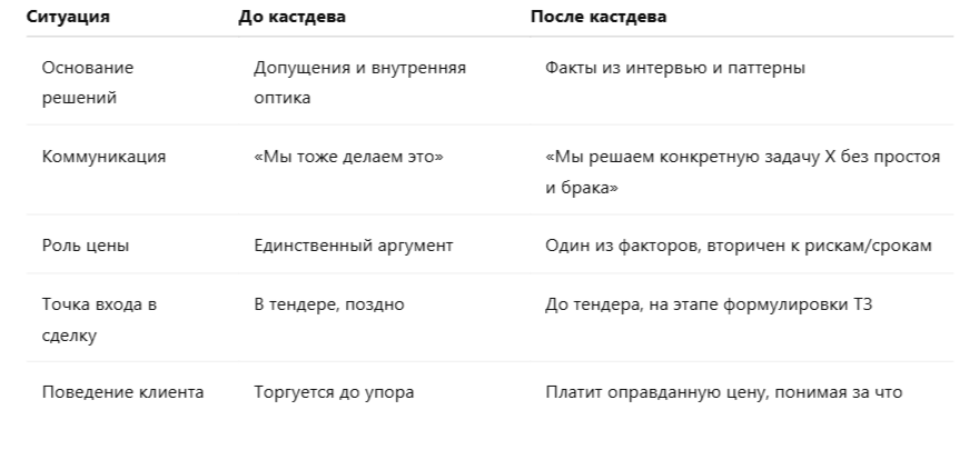Без кастдева вы просто один из многих поставщиков, которых сравнивают только по цене. С кастдевом вы начинаете говорить на языке клиента — появляется понимание, доверие и реальная ценность, а цена уходит на второй план.